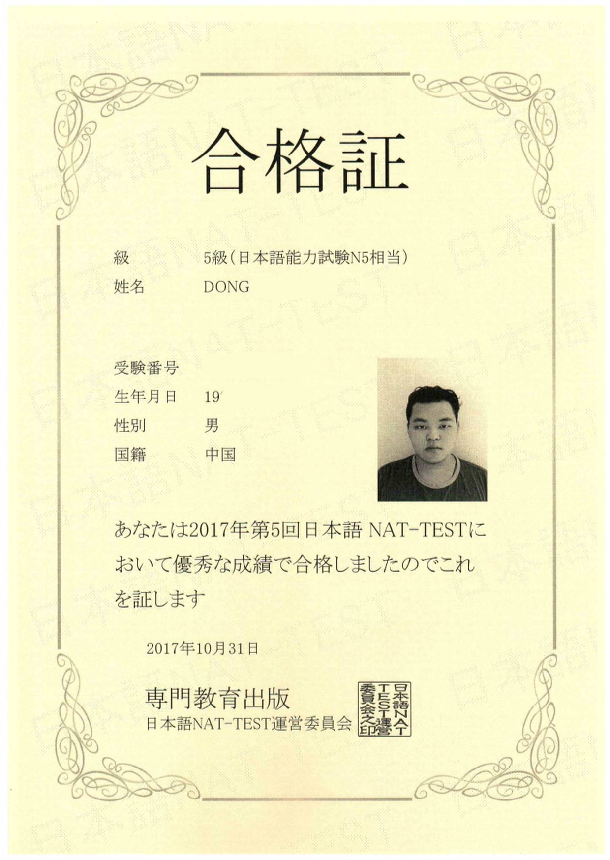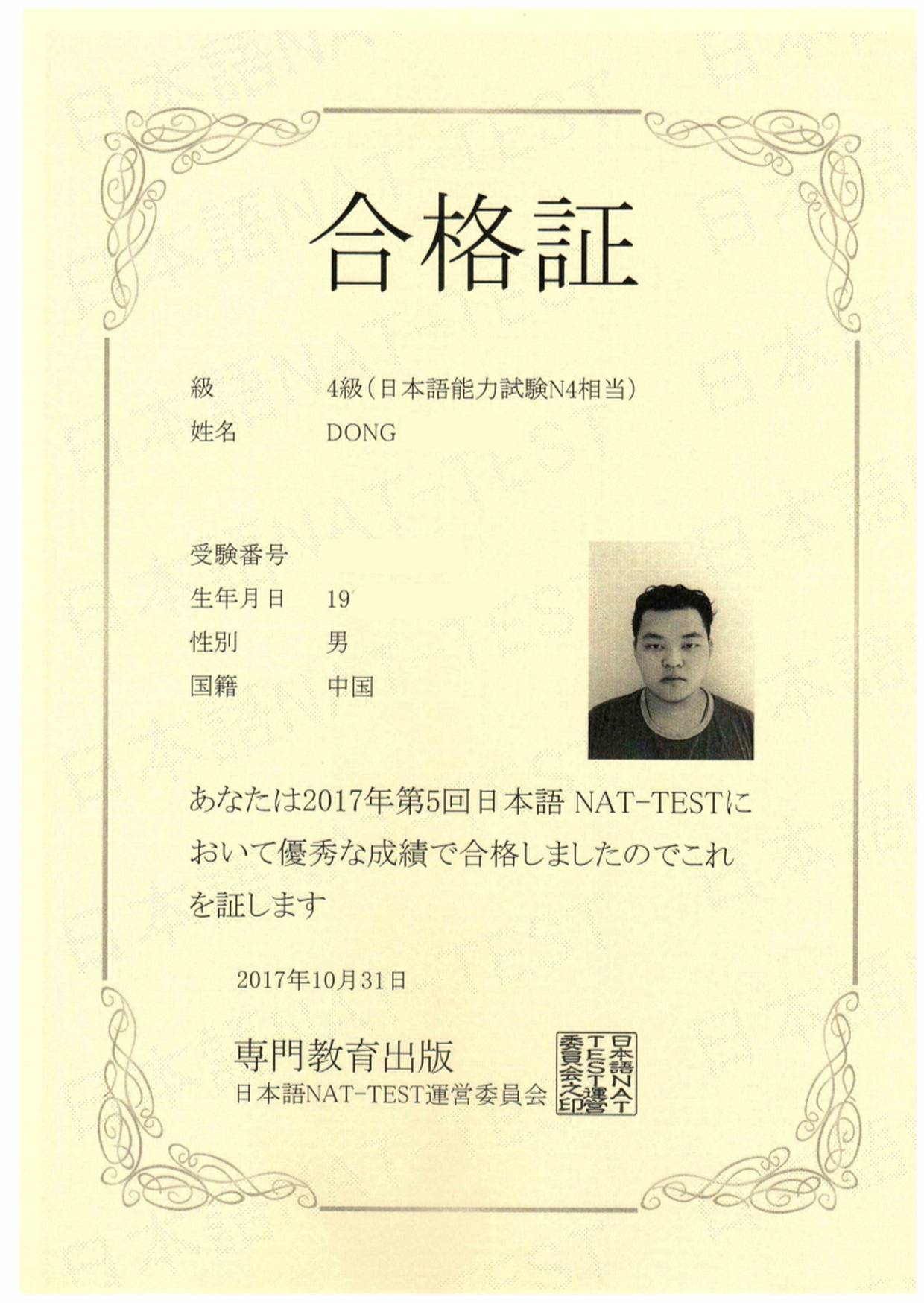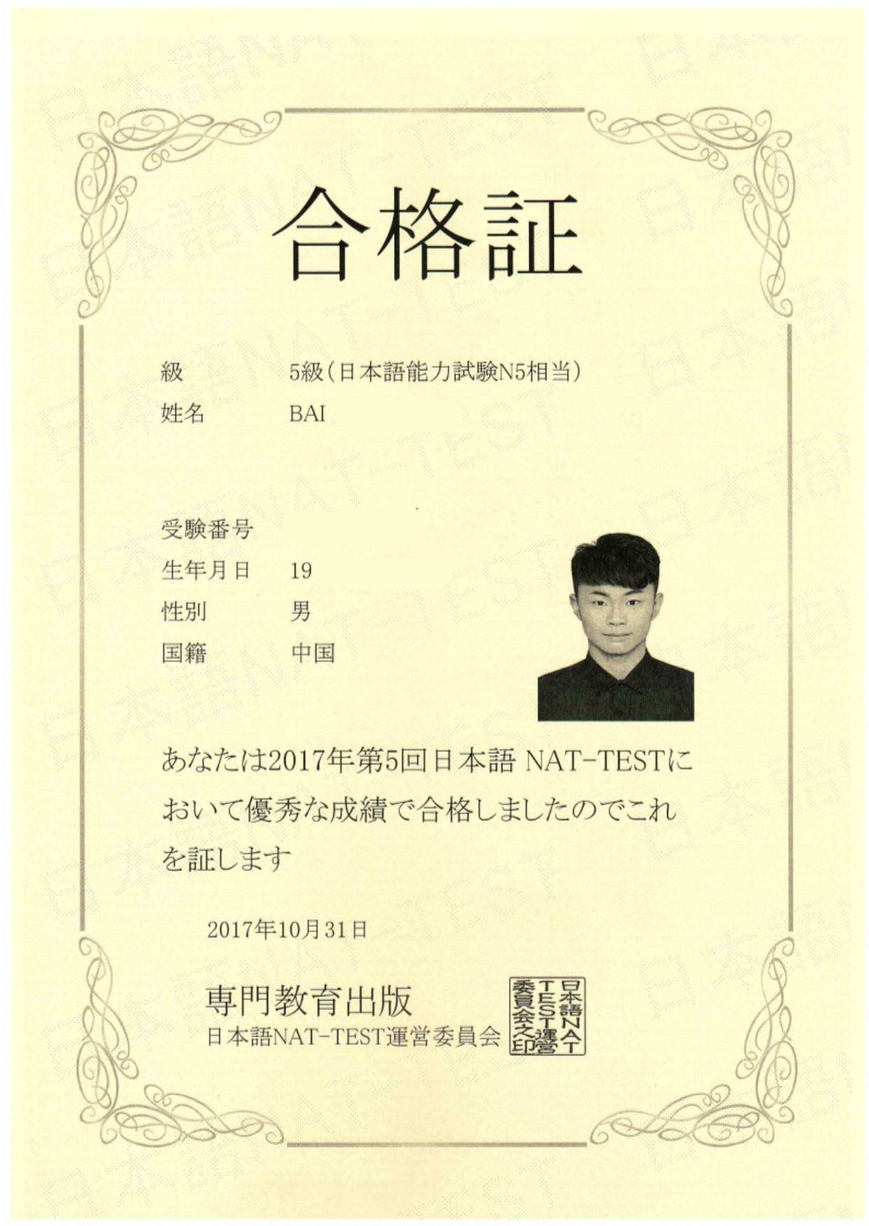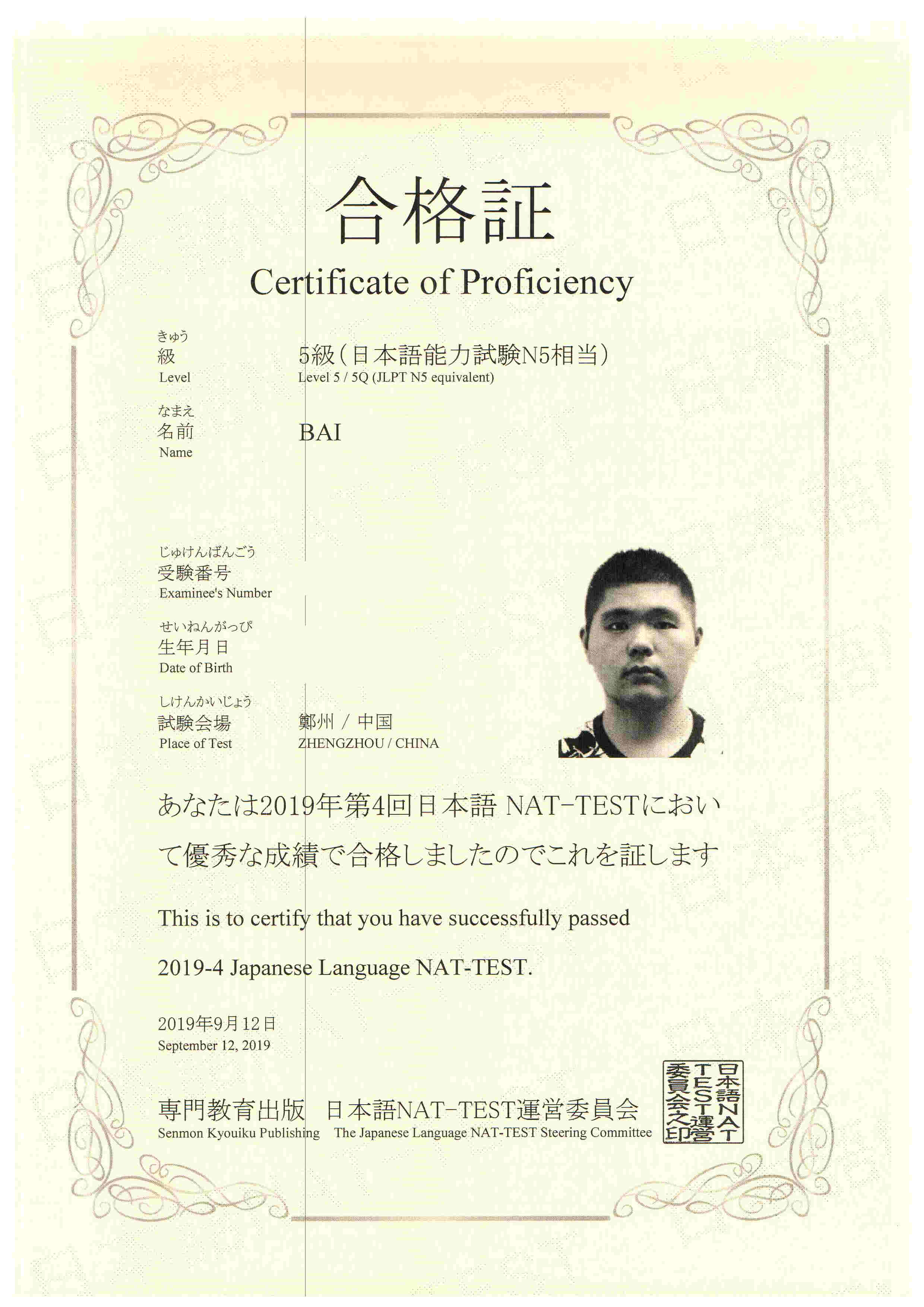 Bin Jie Examination certificate
