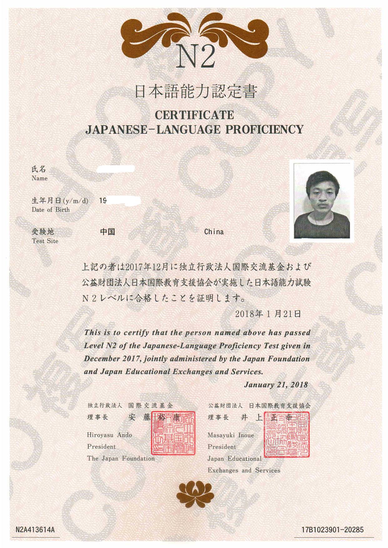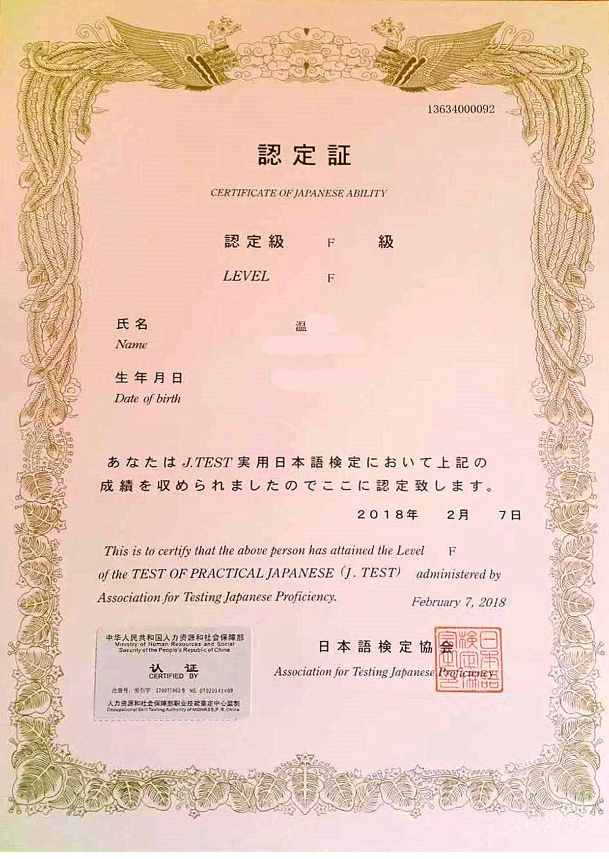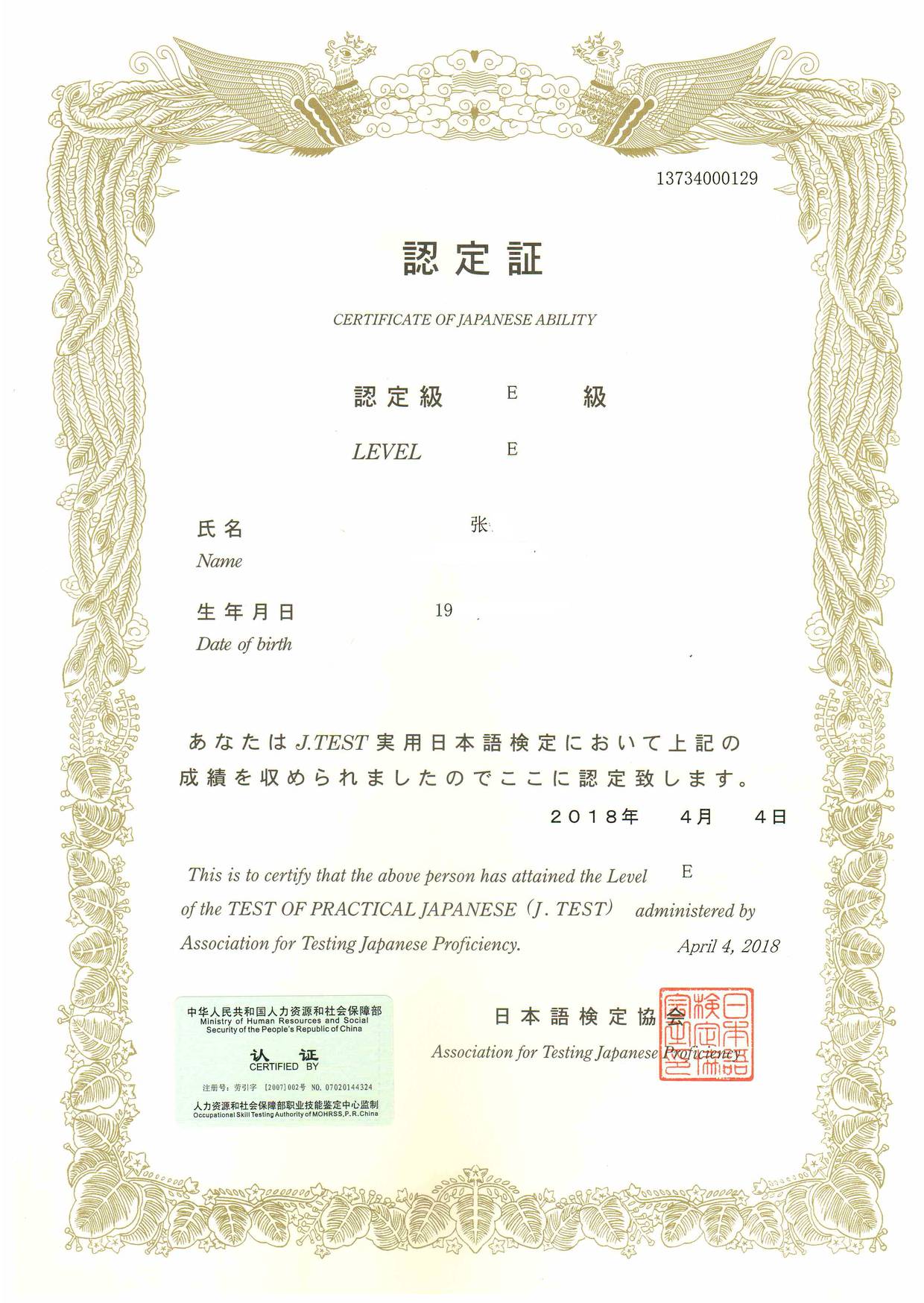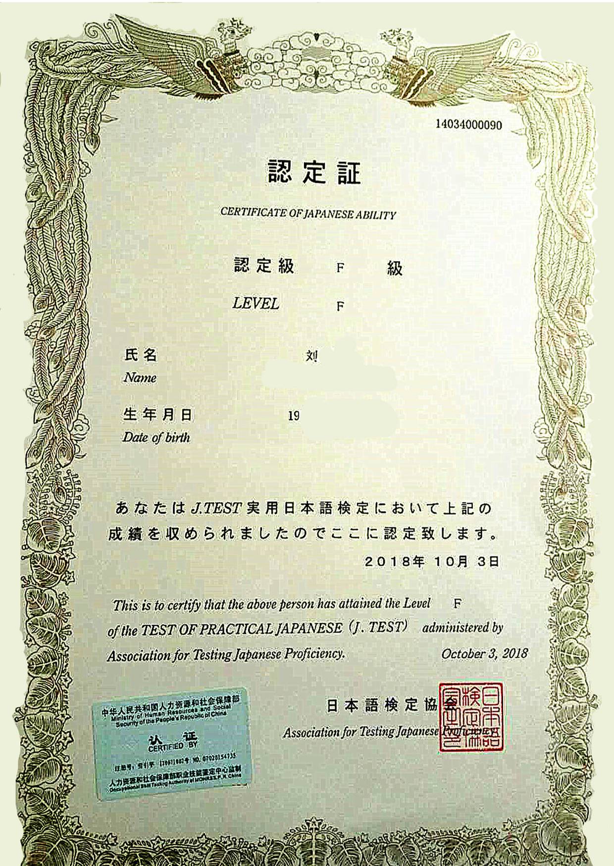 Bin Jie Examination certificate